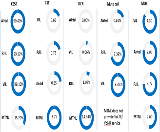 CSSR: Call Setup Success Rate (in %), CST: Call Setup Time (in seconds), DCR: Drop Call Rate (in %) & MOS: Mean Opinion Score.