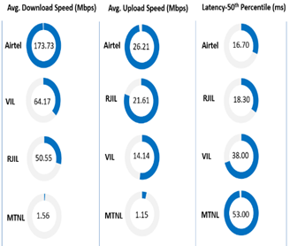 Summary-Data services Data Download performance (Overall): Average download speed of Airtel (5G/4G/2G) is 173.73 Mbps, MTNL (3G/2G) is 1.56 Mbps, RJIL (5G/4G) is 50.55 Mbps and VIL (5G/4G/2G) is 64.17 Mbps. Data Upload performance (Overall): Average upload speed of Airtel (5G/4G/2G) is 26.21 Mbps, MTNL (3G/2G) is 1.15 Mbps, RJIL (5G/4G) is 21.61 Mbps and VIL (5G/4G/2G) is 14.14 Mbps. Latency (Overall): Airtel, MTNL, RJIL & VIL 50th percentile latency is 16.70 ms, MTNL 53.00 ms, RJIL 18.30 ms & VIL 38.00 ms. Data performance - Hotspots (in Mbps): Airtel- 4G D/L: 20.82 4G U/L: 7.18 5G D/L: 198.72 5G U/L: 19.70 RJIL- 4G D/L: 16.19 4 G U/L: 8.98 5G D/L: 108.41 5G U/L: 21.88 VIL- 4G D/L: 19.60 4G U/L: 6.49 5G D/L: 147.51 5G U/L: 14.36 Note- “D/L” Download speed, “U/L” Upload speed 4G & 5G technology have not been observed in MTNL Note- “D/L” Download speed, “U/L” Upload speed |