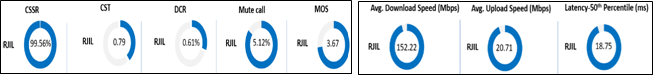 Summary-Data services Data Download performance (Overall): Average download speed of RJIL (5G/4G) is 152.22 Mbps. Data Upload performance (Overall): Average upload speed of RJIL (5G/4G) is 20.71 Mbps. Latency (Overall): RJIL 50th percentile latency is 18.75 ms. Note- “D/L” Download speed, “U/L” Upload speed. |